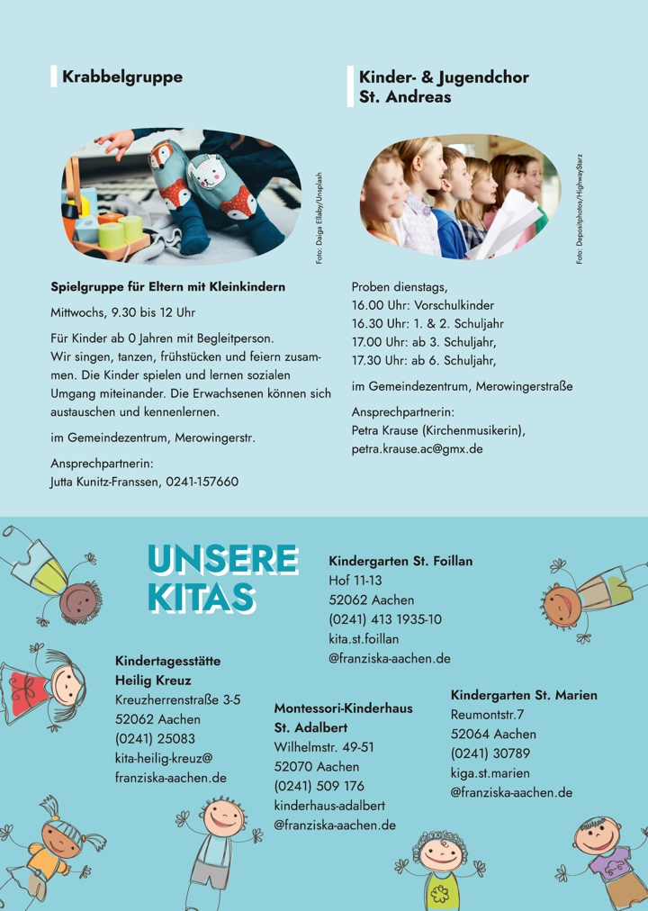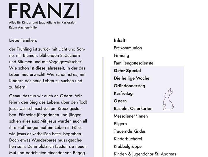 Die FRANZI ist das gedruckte Kommunikationsmedium der Pfarre Franziska von Aachen für Kinder, Jugendliche und Familien. Sie bündelt Angebote, Termine und Formate und macht sie sichtbar.
