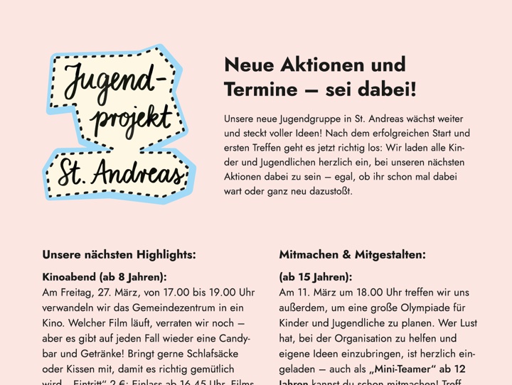 Konzeptionell steht die konsequente Ausrichtung auf die Lebenswelt von Familien im Mittelpunkt. Inhalte werden so aufbereitet, dass sie schnell erfassbar sind und Orientierung im Alltag geben. Die FRANZI verbindet Information mit Einladung: Sie zeigt nicht nur, was stattfindet, sondern macht Beteiligung niedrigschwellig möglich und stärkt die Wahrnehmung der Pfarre als verlässlichen Ort für Familien.